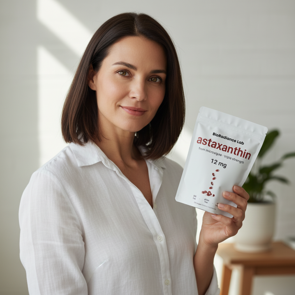 Astaxanthin is a powerful carotenoid pigment found in marine algae that gives salmon and flamingos their pink color. When consumed, it accumulates in your skin cells and provides a subtle, natural golden tone from within. But it's not just about color – Astaxanthin is one of nature's most potent antioxidants, proven to protect skin from oxidative stress, improve elasticity, and reduce visible signs of aging. Clinical studies show it enhances skin moisture levels and reduces fine lines while providing internal UV protection.