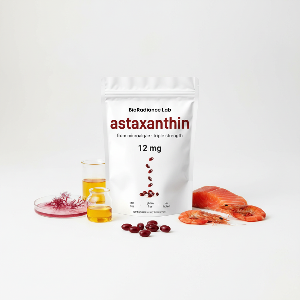 Astaxanthin (12mg) - Ultra-pure, natural astaxanthin from Haematococcus pluvialis microalgae, the most potent source available. Our astaxanthin is 6000x more powerful than Vitamin C as an antioxidant.