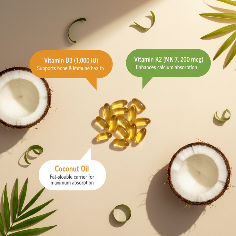 The combination of D3, K2, and coconut oil provides anti-inflammatory support that helps ease joint pain and promotes long-term mobility.